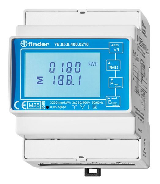 Elektronischer 2-Tarif-Energie- und Blindleistungszähler, Stromwandler-Anschluss, mit Modbus (RS485)- und 2 x S0-Schnittstelle, bidirektional, für 3-Phasen 4-Leiternetz, mit 8-stelliger LCD-Anzeige, hintergrundbeleuchtet, für 3- oder 4-Leitersysteme. Anzeige von Gesamt- und Teilverbrauch (rückstellbar) kWh, kVAh oder kvarh, Gesamt oder pro Phase, Momentanwerte: V, A, Leistungsfaktor, kW, kVA, kvar, Frequenz und Stromrichtung. LED-Verbrauchsanzeige: 3200 Impulse pro kWh. Referenzstrom 1 A, maximaler Dauerstrom 6 A. Kurzzeitüberstrom (Impulsstrom): 120 A für 500 ms, max. Messstrom über Stromwandler: 10000 A. Genauigkeitsklasse C, Reiheneinbaugerät für Tragschiene 35 mm (EN 60715), Baubreite 72 mm, Nennspannung 3 x 230 V AC. Modbus (RS485)-Schnittstelle: Übertragungsrate 2400 bis 38400 Baud. Max. Länge der Busleitung: 1000 Meter, max. anschließbare Zähler: 32. S01-Schnittstelle: 0,01 bis 1000 Impulse pro kWh. S02-Schnittstelle: 3200 Impulse pro kWh. Zähler ist MID-konform. Anschlussquerschnitte Spannungseingänge: eindrähtig 0.5 bis 2.5 mm², mehrdrähtig 0.5 bis 2.5 mm², Umgebungstemperatur: -40 bis +70°C, Schutzart IP51 (innenbereich). Plombierbare Klemmenabdeckungen sind als Zubehör im Beipack enthalten