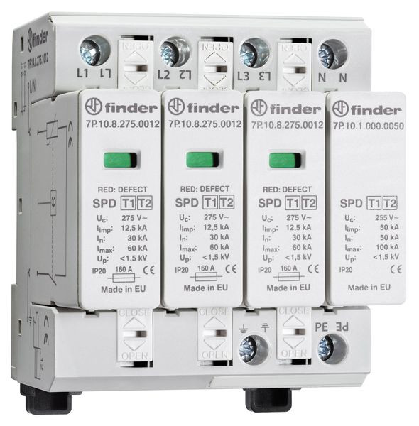 | Kurzbeschreibung | Überspannungsableiter Typ 1 + 2, Varistor zwischen L1, L2, L3-N und Funkenstrecke zwischen N-PE, für 3 phasige TN-S und TT-Netze |