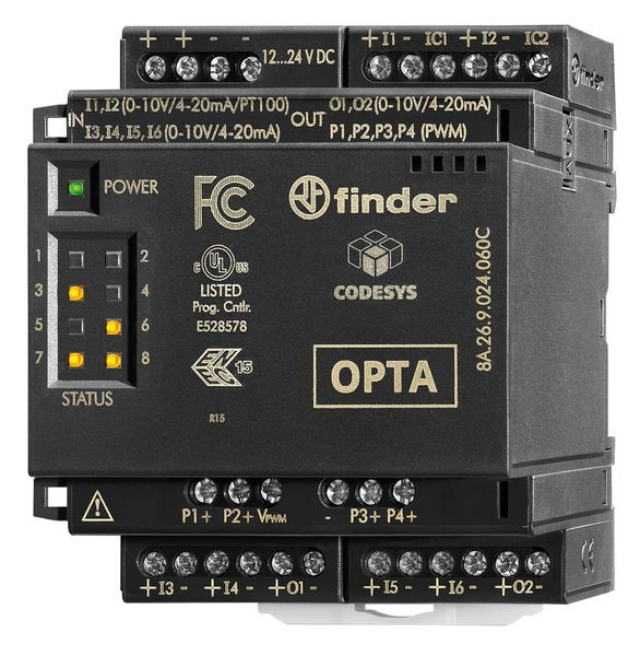 OPTA-Erweiterungsmodul, Programmierung mit Codesys, 6 analoge Eingänge 0...10 V, 4...20 mA, PT 100, 2 analoge 0...10 V, 4...20 mA Ausgänge, 4 PWM Ausgänge, Versorgungsspannung 12…24 V DC, Schnittstelle zu OPTA PLR (nur 8A.04-83xC) und Erweiterungsmodulen (Codesys-Version), insgesamt mit bis zu 5 Erweiterungsmodulen erweiterbar, Power LED und 6 LEDs für Statusanzeige der Ausgänge, 70 mm breit, für Tragschiene 35 mm (EN 60715)