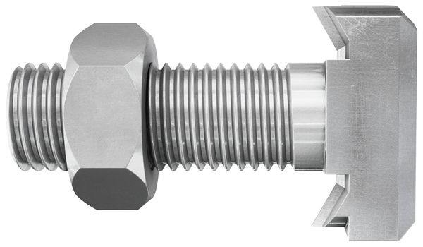 Hammerkopfschrauben mit Kerbzahn, welcher sich beim aufbringen des Installationsdrehmoment in die Schienenlippe einkerbt.
