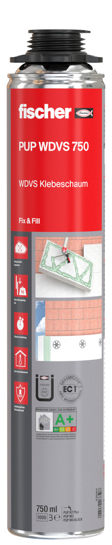 Der fischer WDVS Klebeschaum PUP WDVS 750 ist mit bauaufsichtlicher Zulassung zur Verklebung von EPS-Platten in Wärmedämmverbundsystemen geeignet. Die spezielle Rezeptur garantiert hohe Haftzugfestigkeit. Die hohe Ergiebigkeit macht den Schaum besonders wirtschaftlich. Zudem kann der Klebeschaum für die Verklebung von Dämmplatten im Perimeterbereich, für die Innenwanddämmung, Dachbodendämmung sowie die Dämmung von Kellerdecken verwendet werden. Die sehr geringe Nachexpansion verhindert die Bildung von Hohlräumen und garantiert die sichere Verklebung. Schutzhandschuhe für Endverwender sind beigefügt.