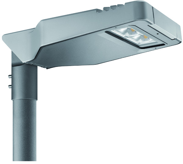 Strassenleuchte in LED- Technik Road 5, Gehaeuse aus Aluminium-Druckguss mit Klimamembran. Farbe Leuchtenkoerper Aluminium / Glasrahmen Graphitgrau, Reflektoren aus bedampften Polycarbonat, mit Flachglasabdeckung aus gehaertetem Sicherheitsglas, Leuchten werkzeuglos zu oeffnen, Die Elektrokomponentenplatte ist werkzeuglos austauschbar. Die Leuchte ist fuer Mastaufsatz mit einem Neigungswinkel von -10° bis +20° und bei Mastansatz mit einem Neigungswinkel von -20° bis +10° einsetzbar.
