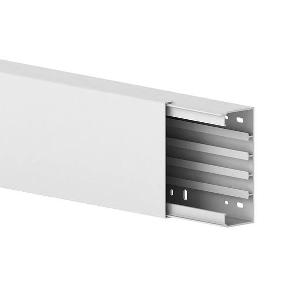 Leitungsführungskanal aus PVC nach DIN EN 50085-2-1 zur Leitungsverlegung an Wand und Decke, bestehend aus komplett übergreifendem Oberteil und Unterteil mit zweireihiger Bodenlochung zur Befestigung und zwei DIN-Schienen für die Einbaumöglichkeit von Geräteeinbaudosen sowie rastbaren Trennwänden, pro 2 Meter Lieferlänge sind 4 frei verschiebbare Kabelhalteklammern inklusive.