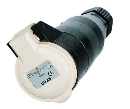 GIFAS Vollgummi-CEE-KupplungAusführung:- 42 V, 16 A- 2-polig- 12 h, IP 44- mit Verschraubung als Kabeleinführung- Geeignet für Nennquerschnitte von 1mm² bis 4mm².