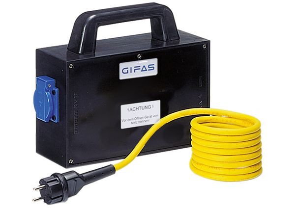 GIFAS Vollgummi-Trenntransformator Typ: 2516 Eingang:3 m GIFAS-PROFLEXX-07 Leitung 2 x 1,5 qmm mit Konturenstecker Ausgang:1 Schutzkontaktsteckdose 230 V ohne Absicherung Einbauten:- 1 Trenntransformator 160 VA, 230/230 V- 1 thermischer Überlastschutz 0,8 A auf der Primärseite Ausführung:Verteiler mit Vollgummi-Transportgriff ausgestattet Abmessungen: H x B x T = 160 x 250 x 90 mmSchutzart: IP 54Gl-Faktor: 1Gewicht: ca. 2,2 kg Eigenschaften:- Gehäuse aus schlagfestem Vollgummi mit hoher mechanischer Festigkeit- beständig gegen Säuren und Basen- sehr gute Wetter-, UV- und Ozonbeständigkeit- hohes elektrisches Isolationsvermögen- Steckdosen und andre Komponenten einzeln auswechselbar und VDE geprüft- Einhaltung aller gültigen elektrotechnischen Sicherheitsvorschriften der VDE