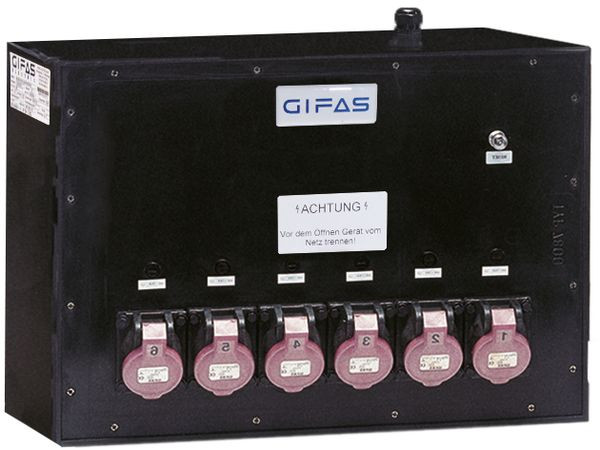 Vollgummi-Verteiler 7900Abmessungen: H x B x T = 360 x 500 x 173 mmSchutzart: IP 54Gewicht: ca. 28 kgGl-Faktor: 0,8Eingang: 1 Kabelverschraubung M 20 von oben(Außendurchmesser der Leitung 7-14 mm)Ausgang: 6 CEE-Einbausteckdosen 2 x 16 A/24 Vabgesichert über Feinsicherungen 16 AEinbauten: Sicherheitstransformator 2000 VA230/24 V, 50 Hz, nach VDE 05701 thermischer Überstromschutzschalter10 A auf der Primärseite1 Einschaltstrombegrenzer 230 V, 50 HzAusführung: Verteiler mit C-Schiene für Wand-befestigung ausgestattet