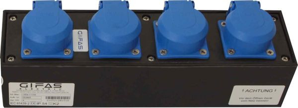 GIFAS Vollgummi-Sicherheitsverteiler Typ 1400Eingang:1 Kabelverschraubung M 20 von oben (Außendurchmesser der Leitung 7-14 mm) Ausgang:4 Schutzkontaktsteckdosen 230 V ohne Absicherung Abmessungen: H x B x T = 290 x 78 x 65 mmSchutzart: IP 54Gl-Faktor: 0,25Gewicht: ca. 1,5 kg Eigenschaften:- Gehäuse aus schlagfestem Vollgummi mit hoher mechanischer Festigkeit- beständig gegen Säuren und Basen- sehr gute Wetter-, UV- und Ozonbeständigkeit- hohes elektrisches Isolationsvermögen- Steckdosen und andere Komponenten einzeln auswechselbar und VDE geprüft- Einhaltung aller gültigen elektrotechnischen Sicherheitsvorschriften der VDE
