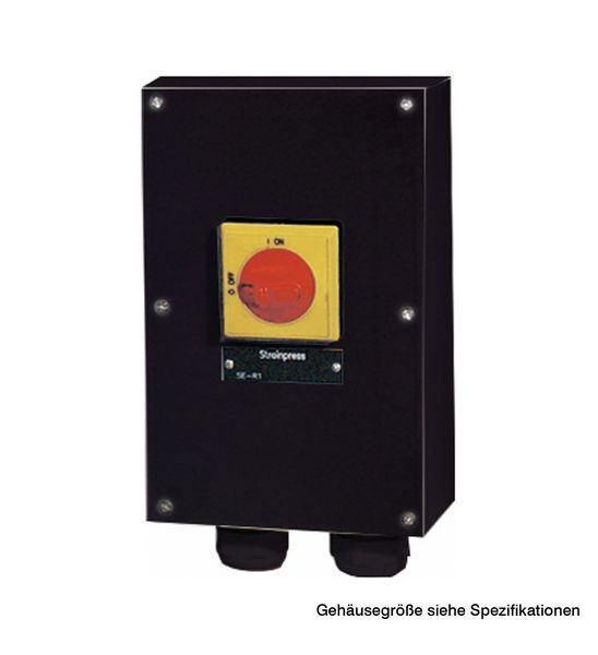GIFAS-Vollgummi-Verteiler Typ 1616Einbauten:- 1 Hauptschalter 40 A, 3polig mit NOT-AUS-Funktion (Griff rot, Kontrastfläche gelb) Dauerstrom 40 A Schaltleistung AC23 = 15 kW bei 3 x 400 V- 2 N/PE-Schienen- 2 Kabelverschraubungen M 32 von unten (Außendurchmesser d. Zuleitung (14-25 mm) Abmessungen: H x B x T = 160 x 160 x 90 mmSchutzart: IP 65Gewicht: ca. 1,7 kg