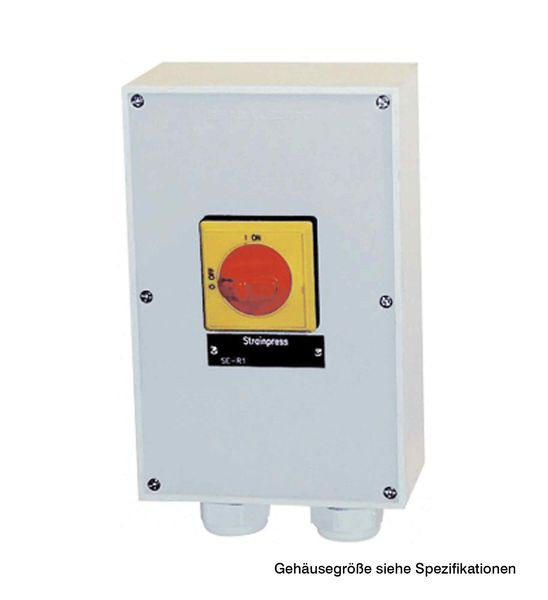 GIFAS-Vollgummi-Verteiler Typ 1616Einbauten: - 1 Hauptschalter 40 A, 3polig mit NOT-AUS-Funktion (Griff rot, Kontrastfläche gelb) Dauerstrom 40 A Schaltleistung AC23 = 15 kW bei 3 x 400 V - 2 N/PE-Schienen - 2 Kabelverschraubungen M 32 von unten (Außendurchmesser d. Zuleitung (14-25 mm) Abmessungen: H x B x T = 160 x 160 x 90 mm Gehäusefarbe: Grau Schutzart: IP 65 Gewicht: ca. 1,7 kg
