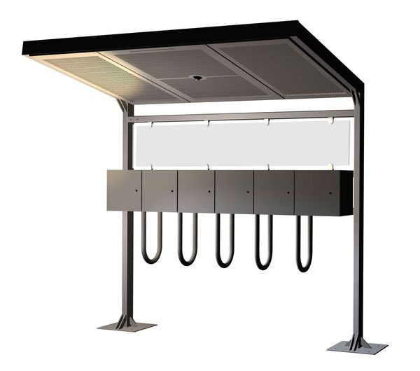 GIFAS E-BIKE Ladestation E650D - die überdachte LadelösungAusführung mit 5 Schließfächern, 1 frontseitigem Versorgungsfach und beleuchteter ÜberdachungNetzanschluss:- Zuleitung von unten über den Standfuss (links)- 1 Reihenklemmblock, 3polig, 4 qmm- V2A Versorgungsfach (innen montierter Vollgummiverteiler Typ 3020)Technische Ausstattung:- 1 Schutzkontaktsteckdose 230 V pro Schließfach- 1 Schutzkontaktsteckdose 230 V im Versorgungsfach- abgesichert paarweise über 3 FI/LS-Schalter (10/0,03A, 2polig mit B-Charakteristik)- Schließsystem mit unterschiedlichen Schlüsseln (Drehzylinderschloss EMKA)- 2 LED-Leuchten 6,8W mit Bewegungsmelder, abgesichert über LS 10A (1polig, mit B-Charakteristik)- 1 Überspannungs-Ableiter zum Schutz von Endgeräten der Industrieelektronik, Typ 3 (Feinschutz) nachEN 61643-11- Schutzart: IP54Besonderheiten:- Integrierte robuste, stabile Haltebügel (hochwertige Parkfunktion am Ladeort)- Geeignet zum Laden von Fahrrädern mit/ohne entnehmbarer AkkueinheitMaterial:- Schließfächer in Edelstahl (V2A, 1.4301) mit einer Fachbreite von 390mm- Standkonstruktion und Dachkonstruktion in Stahlblech (verzinkt)Abmessungen ca.: BxHxT = 2530x2530x1680mm (Breite inkl. Bodenplatte 2920mm)Gewicht ca.: 550kgFarbe: Fächer-Bügel: silber/Edelstahl gebürstet Standkonstruktion: Stahl verzinktOptional:- Andere Schließsysteme (z.B. Münzpfandschloss, elektronisches Zahlencodeschloß oder RFID-Systeme)- Werbetafel, unbedruckt in Acryl (BxHxT: 2390x350x10mm) Art.-Nr. 297613