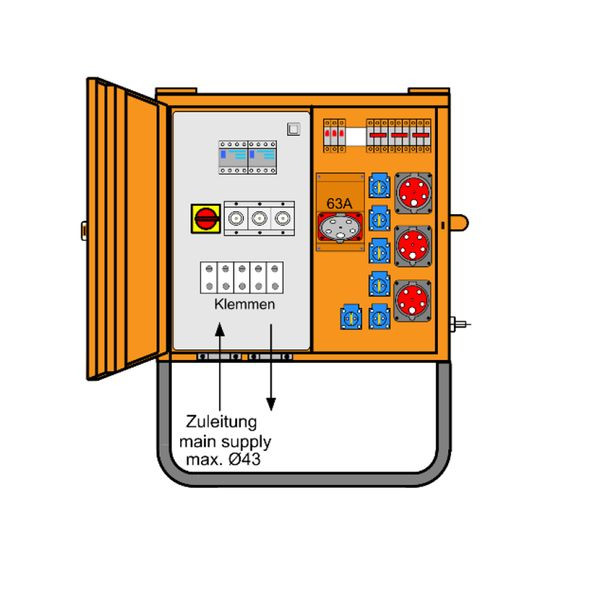 GIFAS-Baustromverteiler BSVVerteilerschrank mit Schuko-/CEE-Abgängen, 44kVAEingang:Klemmbreich 5x35qmmNot-Aus-Hauptschalter (DIAZED DIII/63A)Ausgang:1 FI 63/0,03A Typ B (allstromsensitiv)1 CEE 32A/400V 5pol., 1 LSS C/32A/3pol. 2 CEE 16A/400V 5pol., 2 LSS C/16A/3pol. 1 FI 40/0,03A Typ A6 Schukosteckdosen 16A, 3 LSS C/16A/1polAusführung:- Gehäuse aus Stahlblech verzinkt, Pulverbeschichtung RAL 2000 (gelborange)- Bodengestell feuerverzinkt- Tür mit selbstschließendem Fallriegel (VA), abschließbar durch Vorhängeschloss- Kranösen schwenkbar- alle Einbauten Schutzisoliert- TragegriffeAbmessungen: B x H x T = 710 x 635 x 360 mmSchutzart: IP 44Gewicht: ca. 43 kg- nach DIN EN 61439-1 und 4 (VDE 0660-600-4): 2013-XX "Niederspannungs-Schaltgerätekombinationen - Teil 4 Besondere Anforderungen an Baustromverteiler" (IEC 61439-4:2013)- Als besonderer Speisepunkt nach DIN VDE 0100 Teil 704 zum Anschluss von Wechsel- und Drehstromverbrauchern auf Baustellen.Erfüllt Norm DIN VDE 0100-704