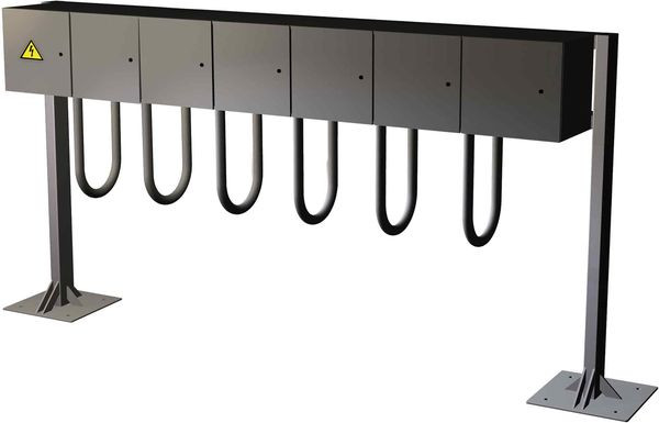 GIFAS E-BIKE Ladestation E760 - die praktische LadelösungAusführung mit 6 Schließfächern, 1 frontseitigem VersorgungsfachNetzanschluss:- Zuleitung von unten über den Standfuss (links)- 1 Reihenklemmblock, 3polig, 4 qmm- V2A Versorgungsfach (innen montierter Vollgummiverteiler Typ 3020)Technische Ausstattung:- 1 Schutzkontaktsteckdose 230 V pro Schließfach- 1 Schutzkontaktsteckdose 230 V im Versorgungsfach- abgesichert paarweise über 4 FI/LS-Schalter (10/0,03A, 2polig mit B-Charakteristik)- Schließsystem mit unterschiedlichen Schlüsseln (Drehzylinderschloss EMKA)- 1 Überspannungs-Ableiter zum Schutz von Endgeräten der Industrieelektronik, Typ 3 (Feinschutz) nachEN 61643-11- Schutzart: IP54Besonderheiten:- Integrierte robuste, stabile Haltebügel (hochwertige Parkfunktion am Ladeort)- Geeignet zum Laden von Fahrrädern mit/ohne entnehmbarer AkkueinheitMaterial:- Schließfächer in Edelstahl (V2A, 1.4301) mit einer Fachbreite von 390mm- Standkonstruktion verzinktAbmessungen ca.: B x H x T = 2930 x 1605 x 450 mm (Breite inkl. Bodenplatte 3320mm)Gewicht ca.: 211 kgFarbe: Fächer-Bügel: silber/Edelstahl gebürstet Standkonstruktion: verzinktOptional:- Andere Schließsysteme (z.B. Münzpfandschloss, elektronisches Zahlencodeschloß oder RFID-Systeme)- Reihenklemmblock für Anschlußleitung 5polig, 4qmm
