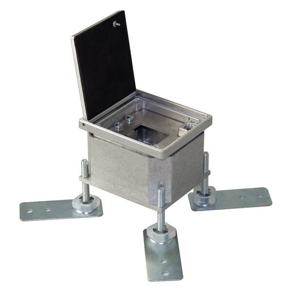 GIFAS Bodensteckdose Typ FONTO 2000Bestückung:keineMaterial: Aluminium naturVerschlussart: abschliessbarer KlappdeckelZuleitung: 2x M25Abmessungen (L x B): 110 x 95 mmEinbautiefe: ca. 75 mmNivellierbar: 72 - 79 mmEinbauhöhe mit Nivellierfuss: 88 - 130 mmEinbauhöhe mit Gewindestiftverlängerung: 88 - 230 mmSchutzart: geschlossen IP65 / offen IP20Belastbarkeit: geschlossen 2t (20kN)Ausführung:- Anwendung: Innenbereich- Deckel bodeneben- nivellierbarer Rahmen (ca. +/- 3 mm)- für 1x Einsatz (Schuko, RJ45, TV-SAT, HDMI, USB etc.)- max. statische Flächenbelastung in Anlehnung an EN 50085- im geschlossenen Zustand: überfahrbar, abschliessbar, geeignet zur Pflege mit Nasskehrgeräten- im gesteckten Zustand: nicht schliessbar, nur für trockengepflegte BödenOptional:- Nivellierfuss (Artikel 154104)- Gewindestiftverlängerung (Artikel 840768)