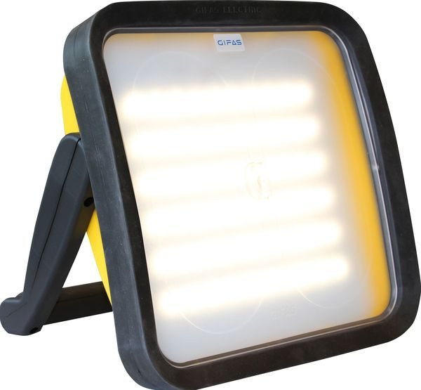 GIFAS PrimaLED AkkuArbeitsleuchte / FlächenstrahlerSystemleistung: 25,2 W / dimmbarLichtstrom: 4200 lm (100%), 2100 lm (50%), 1050 lm (25%)Farbtemperatur: 4000 KAkku: Lithium-Ionen 22,2 V (6000mAh)Leuchtdauer: Leistung (25% 16h), (50% >8h), (100% >4h)Ladezeit: <8hSchutzklasse: IIISchutzart: IP 54Schlagfestigkeit: IK 08Temperaturbereich: -20° C bis +40° CAbmessungen (LxBxH): 305 x 295 x 110 mmGewicht: 3,7 kgEigenschaften:- gelbes Gehäuse aus schlagfestem Polycarbonat- schwarze Gummikanten als Stoss- und Schlagschutz- Tragegriff- Lampenabdeckung aus stoss- und schlagfestem Markolon, schliesst das Gehäuse wasser- und staubdicht ab- satinierte Frontscheibe- Automatische Umschaltung in die Funktion „Energiesparen“ bei nahezu erschöpfter Restladung (15 Minuten Sicherheitsreserve bei 25%)- inkl. Ladekabel und KFZ-Ladekabel