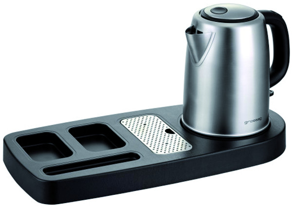 Welcome-Tray aus schwarzem ABS-Kunststoff mit Holzstruktur und entnehmbaren Abtropfgitter aus, zwei Einteilungen (6,4 x 10,6 cm) für Teebeutel etc., eine Einteilung (2,9 x 1 cm) für Löffel, Sticks etc., Wasserkocher-Sockel vom Tray abnehmbar, 46 x 22 cm,