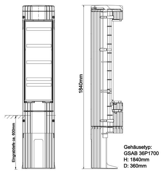 | Kurzbeschreibung | GSAB-Poller rund mit Sockel, Ges.-Höhe 1840mm, Durchm. 360mm mit Sammelschiene 30x5 (185mm) 5-pol. |