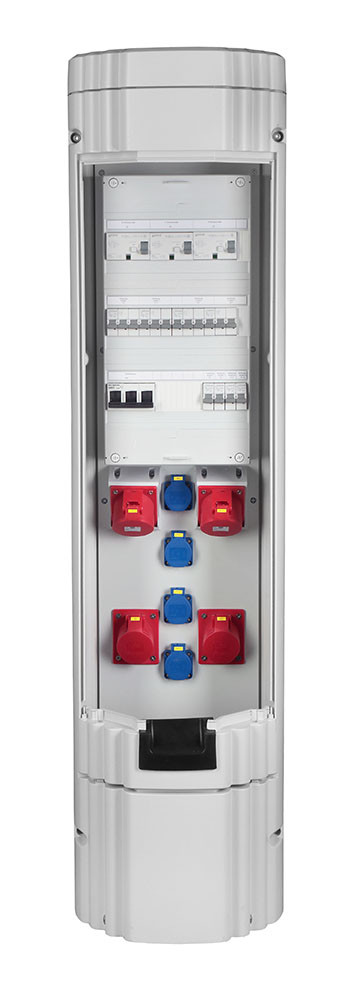 GSAB-Poller mit Sockel, Höhe 1811mm, Durchmesser 360mm, CEE63, 32, 16, 4xSchuko, Festplatzeinführung