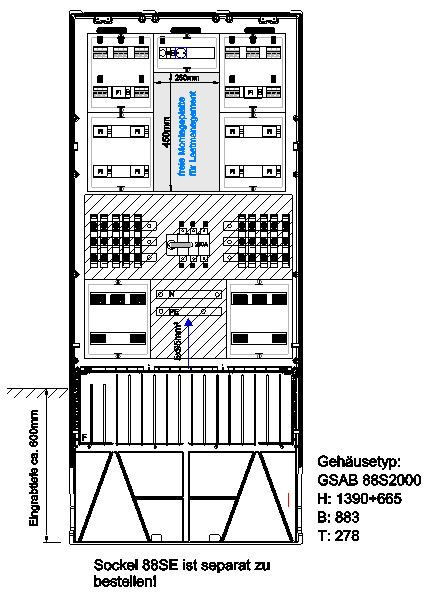 | Kurzbeschreibung | Verteilersäule für Emobility H:1390 x B:883 x T:278mm für 10x11KW Abgänge |