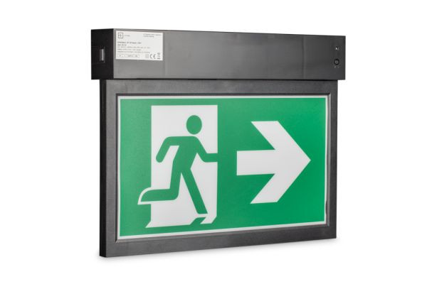 Moderne, unauffällige und ästhetische Rettungszeichenleuchte Unlimited, im Polycarbonatgehäuse in Verkehrsschwarz, RAL 9017. Dank Universalmontage, ohne weiteres Zubehör, an Wand oder Decke montierbar. Sie bestimmen (auch noch vor Ort), wo die Leuchte befestigt wird. Ohne Werkzeug einrastbares Leuchtenmodul, vollständig mit allen elektrischen Betriebs- und Leuchtmitteln, zur schnellen und einfachen Installation.