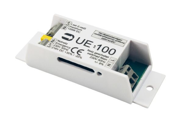 Kurzbeschreibung UE100-BOX - Umschalteinheit 100 | als Umschaltung für Zentralbatterieanlagen 220V AC/DC bei Anliegen einer Spannung am Eingang | max. 120W | im separa