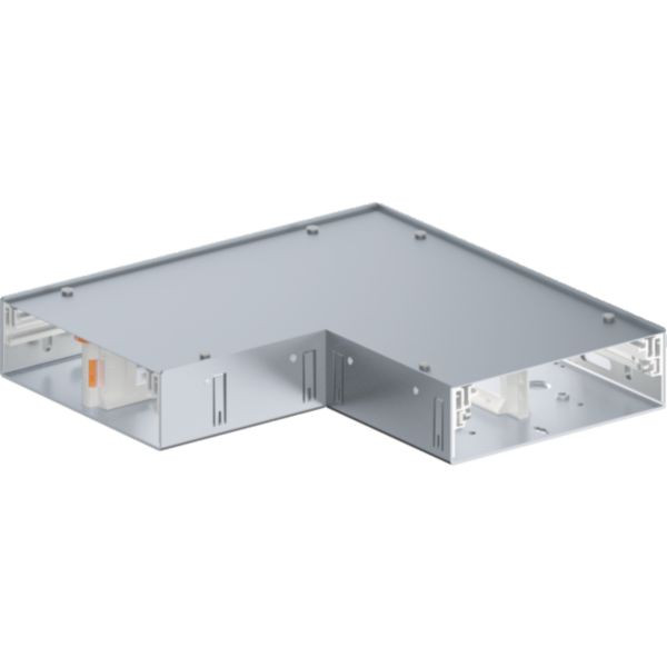Flachwinkel-Unterteil für Bodenkanal BKGD 200x60, geeignet für trockene Innenbereiche mit trockengepflegten Fußböden. Aus Bodenwannenblech gefertigt, inkl. Seitenprofile, Geräteträger und Montageschutz. Verstellbare Bodenanschlagsprofile (0-25 mm) für verschiedene Bodenbelagsstärken. Konform mit DIN EN 50085-2-2. Ideal für Unterflursystemen.