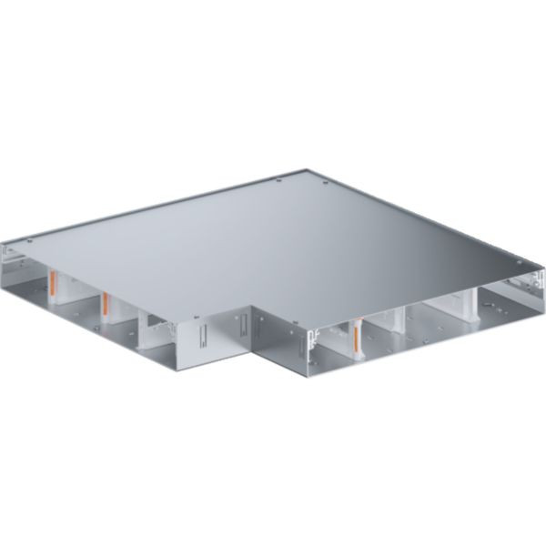 Flachwinkel-Unterteil für Bodenkanal BKGD 500x80, ideal für trockene Innenräume. Aus Bodenwannenblech mit vormontierten Seitenprofilen. Inklusive Geräteträger und Montageschutz. Verstellbereich der Bodenanschlagsprofile: 0-25 mm. Erfüllt DIN EN 50085-2-2. Ideal für Unterflursystemen.