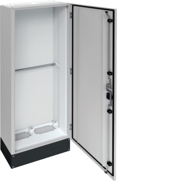 Einzelstandverteiler, univers, IP Standard 55/Schutzklasse II, Maße: 1850x550x275 mm + 200 mm Sockel. Geeignet für Niederspannungsverteilung bis 800 Ampere, 3AC 230/400 Volt 50 Hertz. Konform mit DIN EN 61439-1/-2/-3 und DIN 43 870. Schrank aus 1,5 mm Stahlblech, pulverbeschichtet, mit durchgängiger Türdichtung. Features: Tür mit 110 Grad Öffnung, Schwenkhebelverschluss, stabilisierende Abfangschiene, temperatur- und ölbeständige Dichtung.