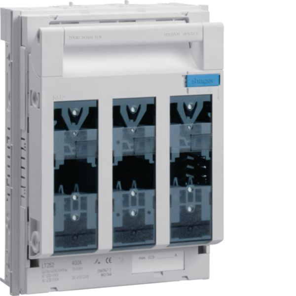 NH2-Sicherungslasttrennschalter für Sammelschiene mit 40mm Abstand und einer Nennstromkapazität von 400A. Geeignet für NH Sicherungseinsätze gemäß IEC 60269-2 / DIN VDE 0636-2. Ausgestattet mit 3-Poligem Schaltunterteil, Allpolig schaltend, und plombierbarem Griffeinsatz mit Berührungsschutz. Ideal geeignet für Energieverteilungen, zeichnet sich besonders durch hohe Zuverlässigkeit und eine robuste Bauweise aus.