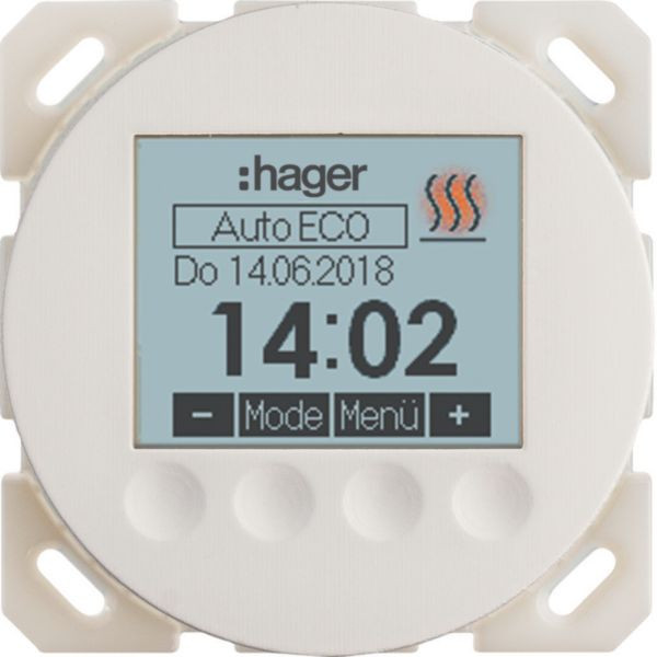 Temperaturregler der R.x für Serie 1930 in polarweiß glänzend mit integriertem Temperaturfühler und beleuchtetem Display. Ermöglicht Hand-/Automatikbetrieb, verfügt über Frostschutzfunktion, Tastensperre und einstellbare Hysterese. Regelbereich der Temperatur ist anpassbar und kalibrierbar. 4 Temperaturmodi und thermische Rückführung über Software. Programmierung der Schaltzeiten durch Kopierfunktion, netzausfallsicherer Programmspeicher. Neutralleiter notwendig. Ideal für Heiz- und Kühlbetrieb.