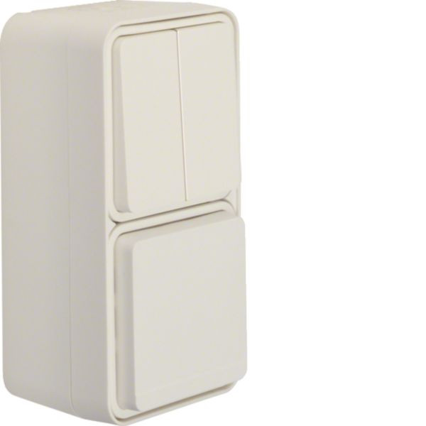 Serienschalter/Steckdose SCHUKO Klappd. erh. B.schutz, AP senk., W.1 IP55,p.weiß