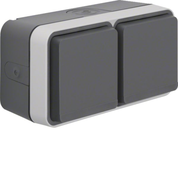 Schuko-Doppelsteckdose für Aufputzmontage, Modell W.1 in grau matt. Ausgestattet mit Klappdeckel und vier Schiebern für erhöhte Sicherheit und Staub- sowie Spritzwasserschutz. Ideal geeignet für Werkstätten, Garagen und Außenbereiche. Robuste Konstruktion für häufige Nutzung.
