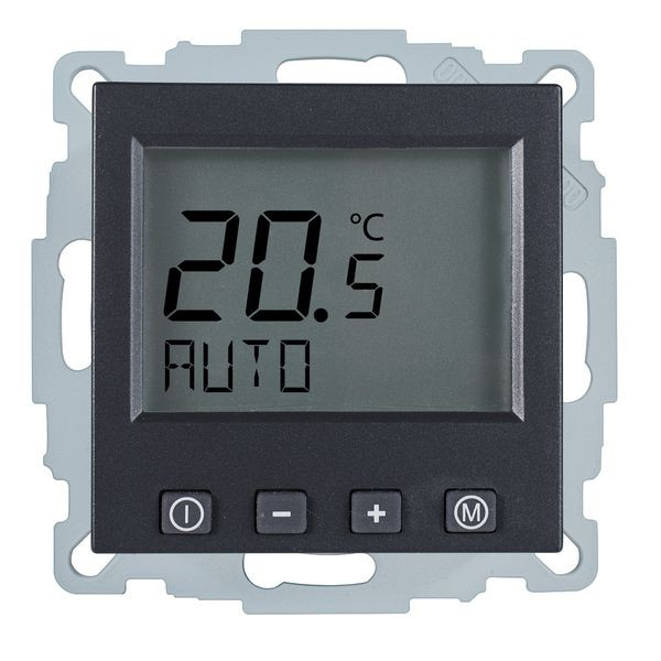 Raumtemperaturregler u.P. Komfort, mit Zeitschaltuhr, großes, beleuchtetes Display, einschl. Zentralscheibe, ohne Abdeckrahmen, einfache Bedienung, Ist- und Solltemperaturanzeige, 10(4)A, 230V, Pumpenschutzfunktion, Umstellmöglichkeit auf Heizen/Kühlen-Funktion und auf Schließerkontakt, für Stellantriebe stromlos geschlossen und stromlos offen, selbstlernendes Regelverhalten, Farbe: anthrazit matt (lackiert), passend in folgende Schalterprogramme: Gira System 55, Berker Serie S.1 / B.3 / B.7, Merten Serie System M