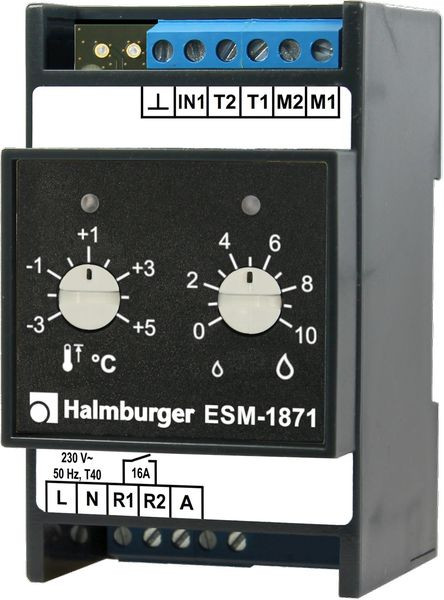 Dachrinnenheizungen zur Steuerung von kleinen bis mittleren Anlagen, ausschließlich in Verbindung mit Sensortyp FD-3354 (nicht im Lieferumfang enthalten), einfache Bedienung über zwei Drehsteller für Aktivierungstemperatur und Feuchteschwelle, ohne Display, ohne Störmeldeausgang, für Verteilereinbau, 3TE, 230 V, IP20, Schaltleistung max. 16 A