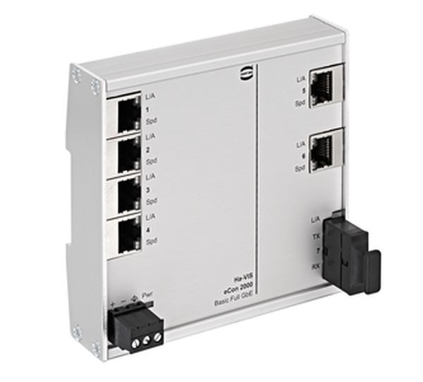 Industrial Ethernet Switches, unmanaged, Full Gigabit Ethernet, Nennspannung: 24, 48, Gesamtzahl der Ports: 7, 10/100/1000 Mbit/s (RJ45-Ports): 6, 1000 Mbit/s (SC-Ports, LX): 1, Betriebstemperatur: -40 ... +70 °C