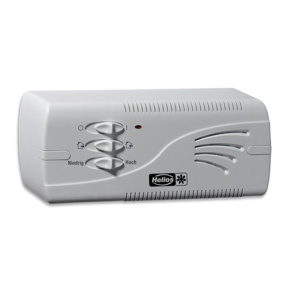 Geeignet für die Typen GX/WX 225 oder 300. Weißes Kunststoffgehäuse, für Auf- oder Unterputzinstallation in trockenen Räumen, Schutzart IP 20. Drei Wippschalter übernehmen folgende Funktionen: zwei poliger Betriebsschalter Ein/Aus mit Betriebsanzeige, hohe bzw. niedrige Drehzahl und Wendeschalter (Be- oder Entlüftung). 230 V~, I max 0.8 A, 50/60 Hz.