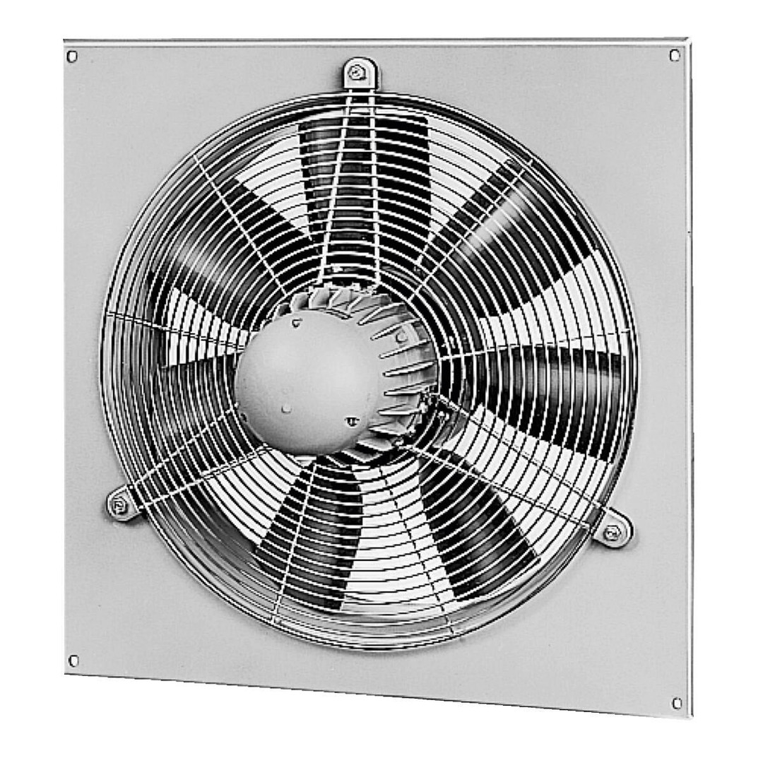 Axial-Hochleistungsventilator im Stillstand verstellbare Schaufeln, quadratische Einbauplatte, Einströmdüse, direkt angetrieben, explosionsgeschützt gemäß ATEX. Quadratische Einbauplatte mit angeformter Düse aus verzinktem Stahlblech. Laufrad mit 7 Schaufeln aus Thermoplast. Hoher Wirkungsgrad, niedriges Betriebs- geräusch. Vibrationsfreier Lauf durch dynamische Wuchtung nach Gütestufe G 6.3 VDI 2060 und DIN ISO 1940. Einsetzbar im Bereich von -20 °C bis +40 °C. Oberflächen- widerstand geringer als 1 GOhm. Drehstrom-Kurzschlußläufer-Motor, geschlossene Bauweise, wartungsfrei, gedichtete, geräuscharme Kugellager mit Langzeitschmierung, nicht regelbar. Ex-Ausführung gemäß ATEX.