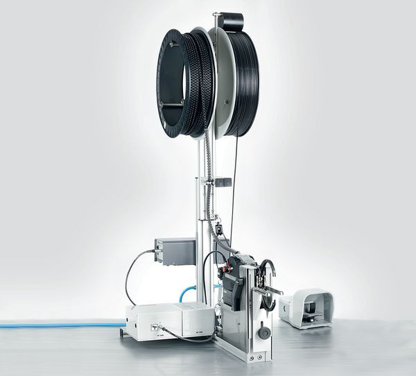 Montagevorrichtung 3080 für stationären Einsatz, inklusive Fußpedal. Optional auch mit Mikroschalter (Doppelhebelauslösung). Zusätzlich wird eine Durckluftversorgung (6 bar) benötigt. Materialzuführung erfolgt über Materialspulen. Durch die Montagevorrichtung hat der Anwender beide Hände frei, um den Bündelprozess präzise durchführen zu können.