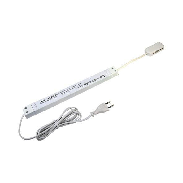 Elektronischer Sicherheitstransformator 24V DC, Netzanschlussleitung 2m mit Eurostecker, 12-fach Verteiler, max. zulässige Länge der Sekundärleitungen 5m, mit 17mm Höhe sehr flache Bauweise