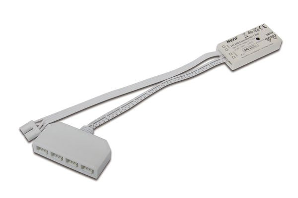 Bluetooth Low Energy-Controller zum Schalten und Steuern von 24V RGB Leuchten, Steckerfertig und optional, für jede Neuinstallation oder nachträgliche Erweiterung des bestehenden Systems, ansteuerbar über jedes iOS oder Android Smartphone oder Tablet (mit kostenloser App), mit Memory-Funktion (nach Netztrennung wird der Zustand wieder hergestellt), Anschlussleitung mit zwei LED 24-Steckern und 4-fach Verteiler für die Leuchten