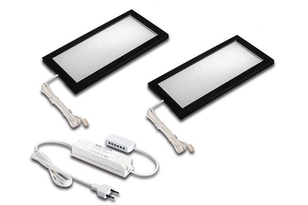 Quadratische, flache LED-Unterbauleuchte mit homogenem Flächenlicht, Gehäuse Kunststoff, als 2er Set, Anschlussleitung 2,5m mit LED 24-Stecker, Lichtfarbe neutral weiß ca. 4000K, inkl. steckerfertigem 30W Trafo, optionales Zubehör: Dimm-Controller mit Funkfernbedienung, WiFi App, DALI, 1-10V oder Sonar