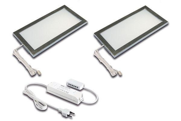 Quadratische, flache LED-Unterbauleuchte mit homogenem Flächenlicht, Gehäuse Kunststoff, als 2er Set, Anschlussleitung 2,5m mit LED 24-Stecker, Lichtfarbe neutral weiß ca. 4000K, inkl. steckerfertigem 30W Trafo, optionales Zubehör: Dimm-Controller mit Funkfernbedienung, WiFi App, DALI, 1-10V oder Sonar