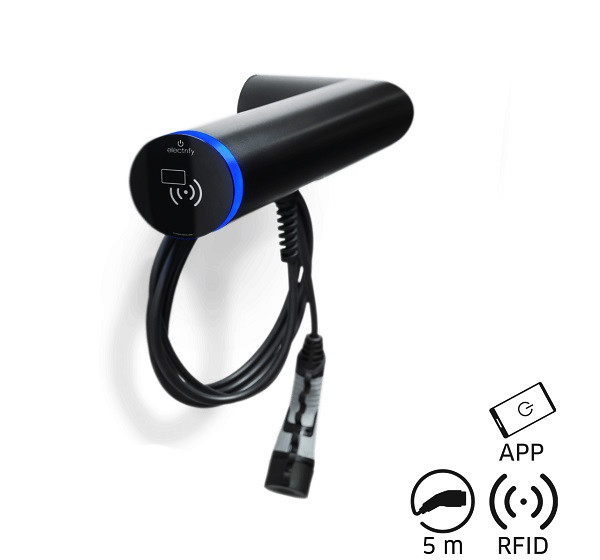 Wallbox Sonderkabellänge, Ausrichtung waagerecht links, Ausführung BASE, schwarz matt pulverbeschichtet (RAL 9005), max. Ladeleistung 11kW, max. Ladestrom 16A, DC-Fehlerstromerkennung, im Innen- und Außenbereich frei positionierbar, Autorisierung über RFID oder Smartphone über eCC App (electrify Charge Control), Plug and Start, WLAN und digitale Eingänge, Master / Slave via electrify Mesh, Modbus TCP, 5 Meter Ladekabel (Typ 2), Klimasystem durch Axiallüfter und Heizung, Schutzart IP 54, einfache Montage, incl. 1x RFID-Karte, Wandadapter zur Aufputzinstallation, Befestigungsmaterial, Adapter digitale Eingänge, Gerätepass, Montagekurzanleitung