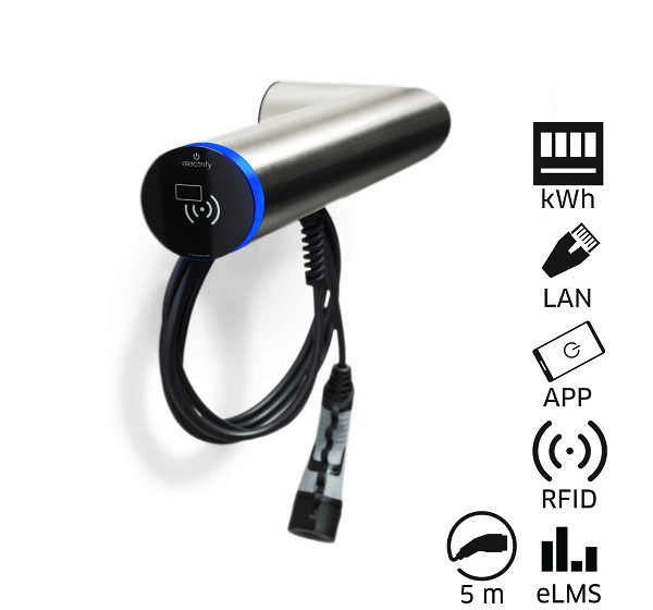 Wallbox Sonderkabellänge, Ausrichtung waagerecht links, Ausführung SMART, Edelstahl gebürstet, max. Ladeleistung 11kW, max. Ladestrom 16A, MID-konformer Energiezähler, DC-Fehlerstromerkennung, im Innen- und Außenbereich frei positionierbar, Autorisierung über RFID oder Smartphone über eCC App (electrify Charge Control), Plug and Start, LAN und WLAN und digitale Eingänge, Master / Slave via electrify Mesh, Modbus TCP, OCPP Einbindung, kostenloses Backend über eLMS (electrify Lademanagementsystem), 5 Meter Ladekabel (Typ 2), Klimasystem durch Axiallüfter und Heizung, Schutzart IP 54, einfache Montage, incl. 2x RFID-Karte, Wandadapter zur Aufputzinstallation, Befestigungsmaterial, Adapter digitale Eingänge, Gerätepass, Montagekurzanleitung