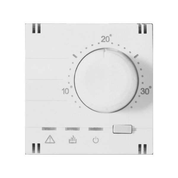 Temperaturregleraufsatz analog weiß, Abdeckung für Einsatz 90500490-DE, Steuerungseinheit mit Zentralscheibe 50x50mm, passend für alle gängigen Schalterfabrikate in Verbindung mit Zwischenrahmen, zur Montage auf Thermostateinsatz, mit Drehregler, Frostschutzfunktion, Schalter Ein/Aus sowie Kontroll- LED für Ein, Heizen und Frostschutz, Temperaturbereich +5°C bis +30°C, Schaltdifferenz 1K, IP20