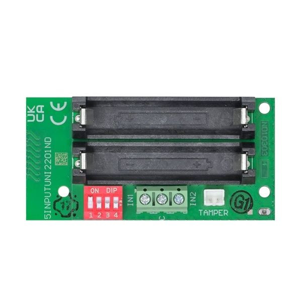 Einbau-Funk-Universalsender mit zwei Eingängen für verdrahtete Melderkontakte. Anschlussklemmen für Alarmlinien 1 und 2 (jeweils wählbar als NO, NC oder mit Endwiderstand), einstellbar zwischen Meldung bei Aktivierung / Deaktivierung oder nur bei Aktivierung. Zusätzlicher Anschluss für einen Sabotagekontakt. Wahlweise kann der Sender zum Anschluss von einem oder zwei Wassersensoren 9000WS verwendet werden. Funkfrequenz: 868MHz. Spannungsversorgung: 2x alkalische Batterie AAA 1,5V (mitgeliefert). Belegt eine oder zwei Adressen im System 9000. Betriebstemperatur: -10°C bis +40°C. Kann in einer UP-Dose oder in der Montagedose 9000BD1/2/3 montiert werden. Abmessungen: 75 x 38 x 15mm.