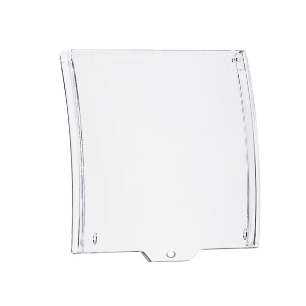 Transparente Schutzabdeckung für Handmelder. Zum Auslösen des Melders muss die Abdeckung hochgeklappt werden. Schutzklappe mit Sicherungsöse zur Vermeidung von Fehlauslösungen. Abmessungen: 93 x 98 x 11mm.
