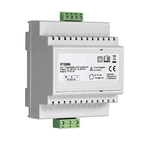 Netzgerät in REG-Gehäuse für VT100 Video-Türsprechsystem. Versorgt bis zu 4 Innenstationen pro Ruftaste. Zur Hutschienenmontage (TS35, 4 TE). Eingangsspannung: 230V, 50Hz. Ausgangsspannung: 15V DC, 4A. Abmessungen: 70 x 91 x 59mm.