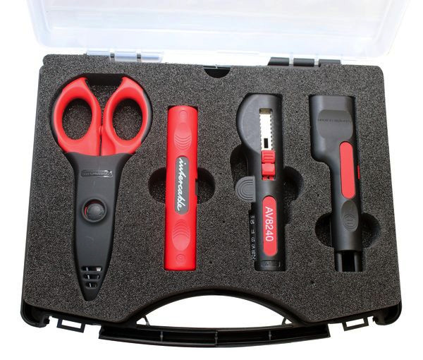 Die wichtigsten Werkzeuge „rund ums Kabel“ für die Elektroinstallation in einem Set. Die ergonomischen und rutschfesten Werkzeuge zeichnen sich durch eine gute Handhabung aus. Das Werkzeugset garantiert Ihnen bei hoher Flexibilität, schnelles und sicheres Arbeiten auf der Baustelle. Speziell auf die Bedürfnisse des Elektrohandwerks entwickelte Werkzeuge bieten ein hohes Maß an Qualität und Sicherheit.Werkzeuge befinden sich in einem Kunststoffkoffer.Bestückung: 16020-F1 - Kabelschneiderschere + Safetybox, AV8240 - Quadro-Entmanteler mit Hakenklinge, AV8245 - Coax-Entmantler, AV8250 - Datenkabel Entmanteler