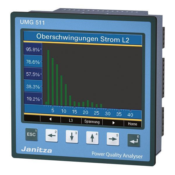 Power Quality Analyser, UMG 511Versorgungsspannung: 95 - 240V (50 - 60Hz); 80 - 340V DCInstallationskategorie: 300V CATIII4 Spannungsmesseingänge,Messkategorie: 600V CATIIIMessung in Dreiphasen-4-Leitersystemen bis 417V/720V,Messung in Dreiphasen-3-Leitersystemen bis 600V,Messbereich: L - N: 10 - 600V; 15 - 440HzMessbereich: L - L: 18 - 1000V; 15 - 440Hz4 Strommesseingänge für Stromwandler ../1 oder ../5AMessbereich: 0,001 .. 7,4Arms,8 Digitaleingänge, 5 Digitalausgänge,Datenspeicher: 256MB Flash,Schnittstellen: RS485, Profibus DP V0, Ethernet 10/100 BaseTXZubehör:Art.Nr.: 5219301, 2 BefestigungsklammernArt.Nr.: 0801505, Cross-Patch-Kabel, CAT5e, 2m, grau/grünArt.Nr.: 3303072, Installations- und Inbetriebnahmeanleitung3Programmiersoftware „ GridVis Basic” download: www.janitza.de/gridvis-download.html