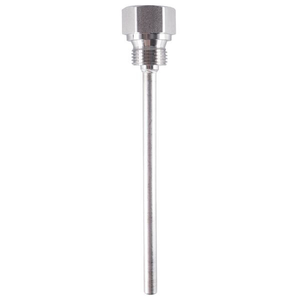 Die Schutzhülse zum Einschrauben aus Edelstahl (Werkstoff Nr. 1,4571) ist passend für einen Fühler mit Durchmesser 6 mm. Montiert wird die Hülse mit einem Gewinde G 1/2 Form A gemäß DIN 3852/2. Die maximale Druckbelastbarkeit bei einer Temperatur von 150 °C beträgt 88 bar.